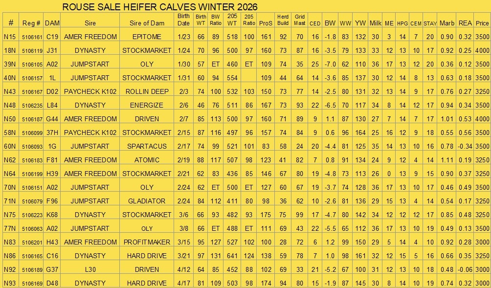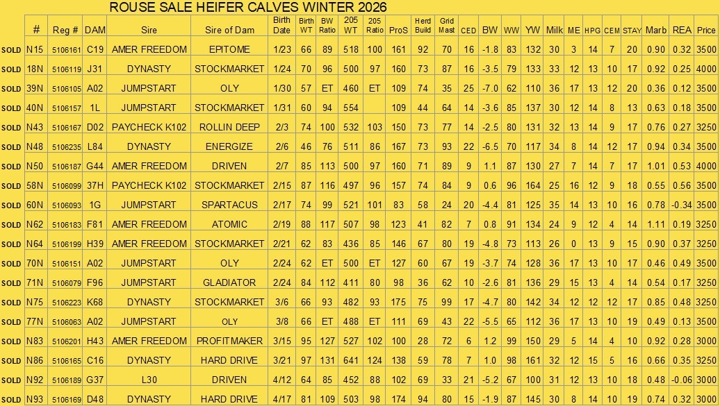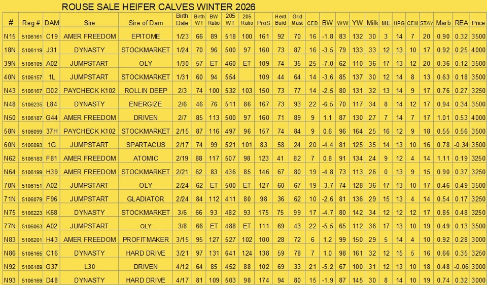 We are once again offering the following group of 19 open heifers for sale by private treaty. We have more good heifers than we have room to keep here, and we feel these heifers will make excellent cows. They have all been 50K tested, and those results are now reflected in their EPDs. We apologize for the delay in getting pictures posted, the late fall weather didn’t cooperate for us, but we have finally got them. Feel free to call or email if you have any questions. We would be happy to show them to you!