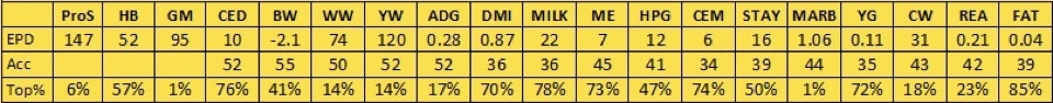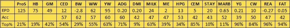B97 has risen to the surface as one of our top cows, as well as now being one of our oldest cows in production. She is one of our favorites from a terrific set of flushmate sisters, out of Epic and our R31 donor, which makes her a maternal sister to Samurai. B97 is a deep bodied cow with an awesome disposition and impeccable feet. She has a great spread from low birth to high growth, with her calves’ average birth ratio of 98, average wean ratio of 103, and average yearling ratio of 105. She has shown great fertility as well, settling AI in the first cycle in all of her first 9 years. Unfortunately that streak came to an end in 2022, but she still settled on the second cycle, and in 2023 she started a new streak. We skipped over B97 and flushed her daughter E40 (profiled above), but I wouldn’t be shocked if we still flushed B97 at some point before her career is over.